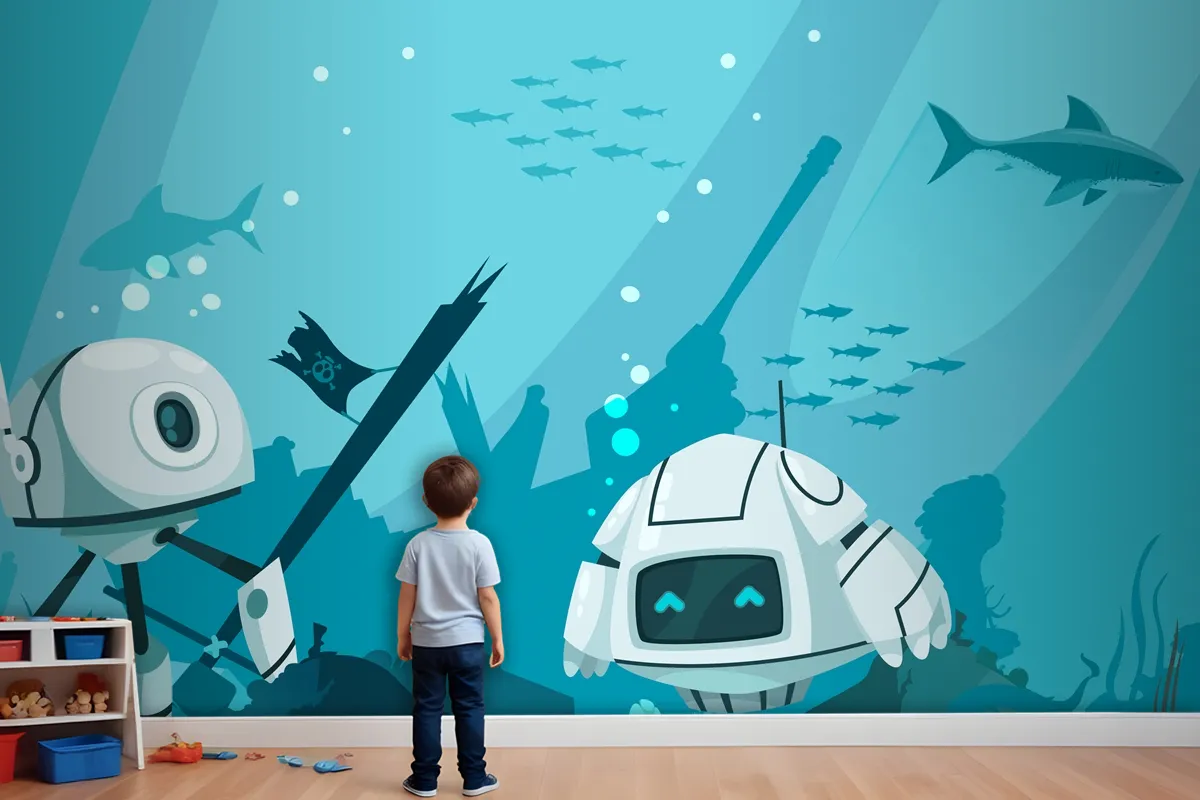 Fütüristik Robotlar Deniz Kompozisyonu Çocuk Odası Duvar Kağıdı