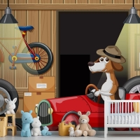 Garajda Arabayı Süren Köpek Çocuk Odası Duvar Kağıdı