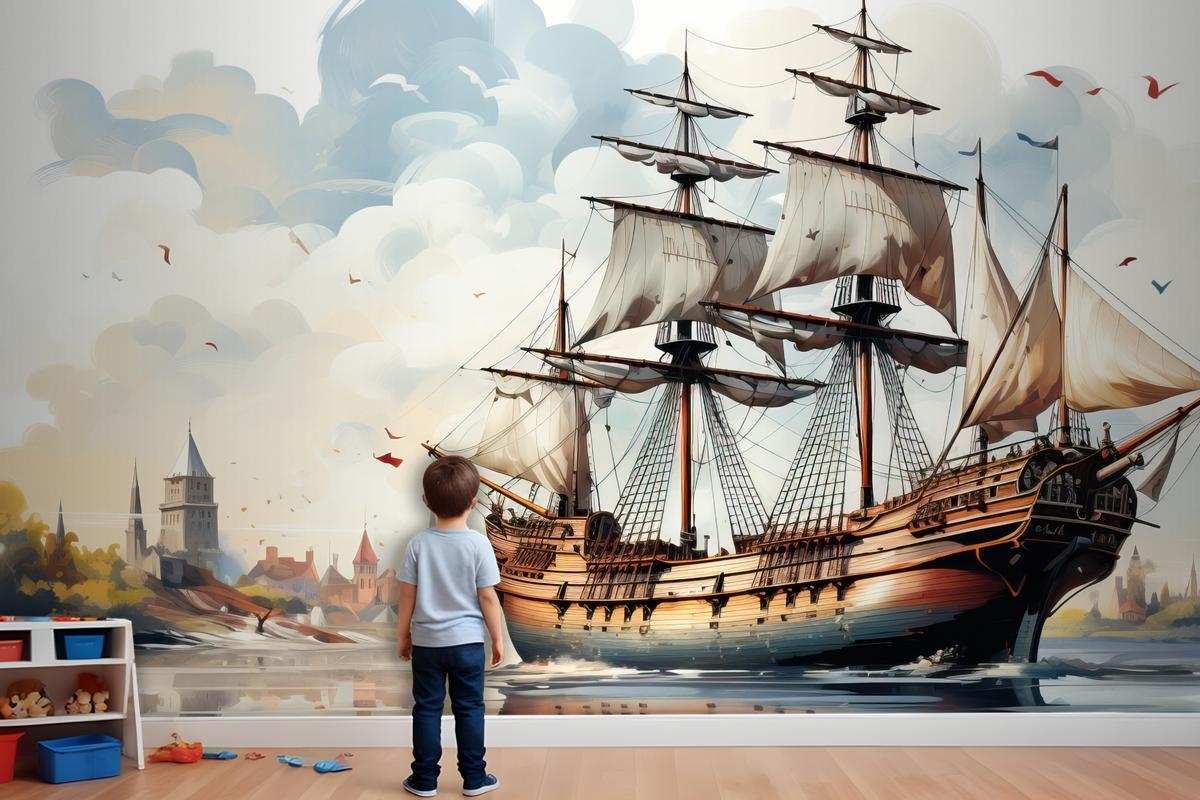 Geometrik Düz Tasarım Şehir Manzaralı Başkent Gün Batımı Çocuk Odası Duvar Kağıdı