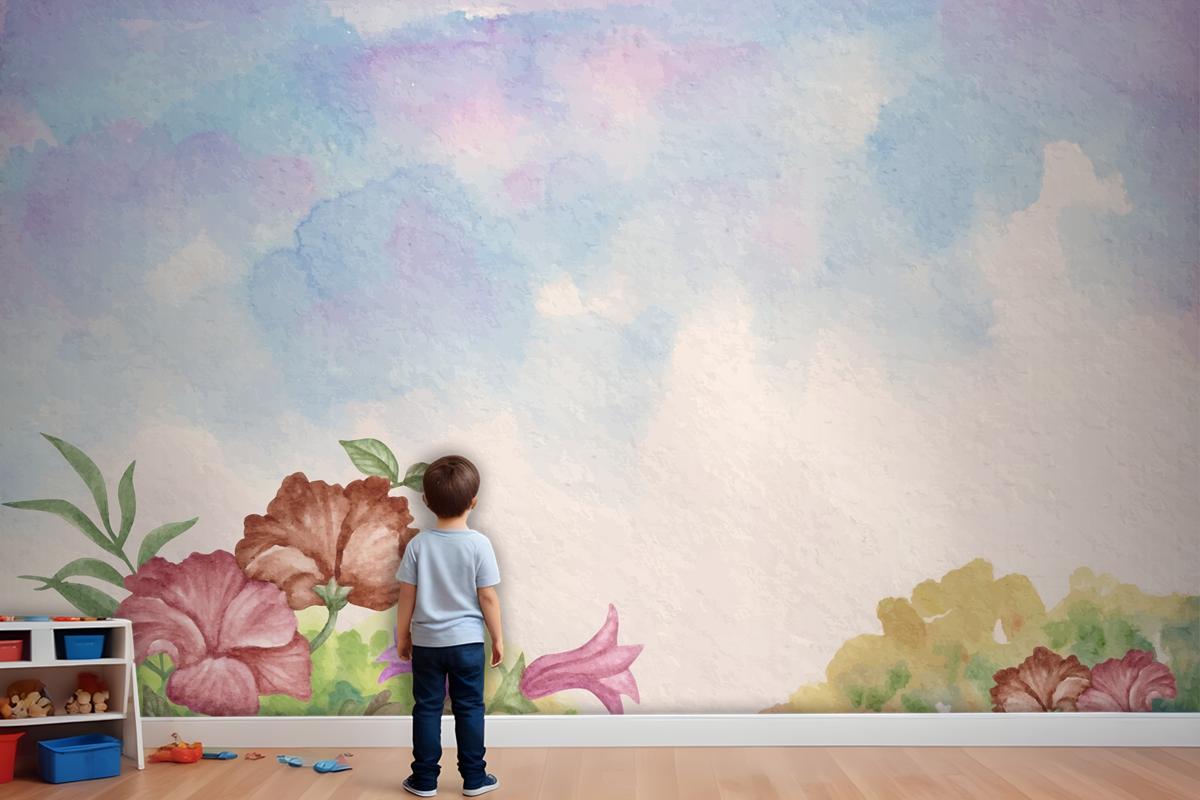 Gökyüzü Görünümü Suluboya Manzara Arka Plan Çiçekli Çocuk Odası Duvar Kağıdı