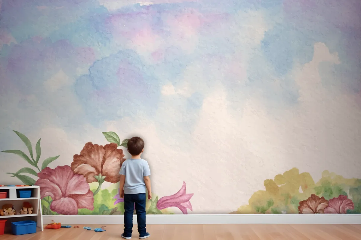 Gökyüzü Görünümü Suluboya Manzara Arka Plan Çiçekli Çocuk Odası Duvar Kağıdı