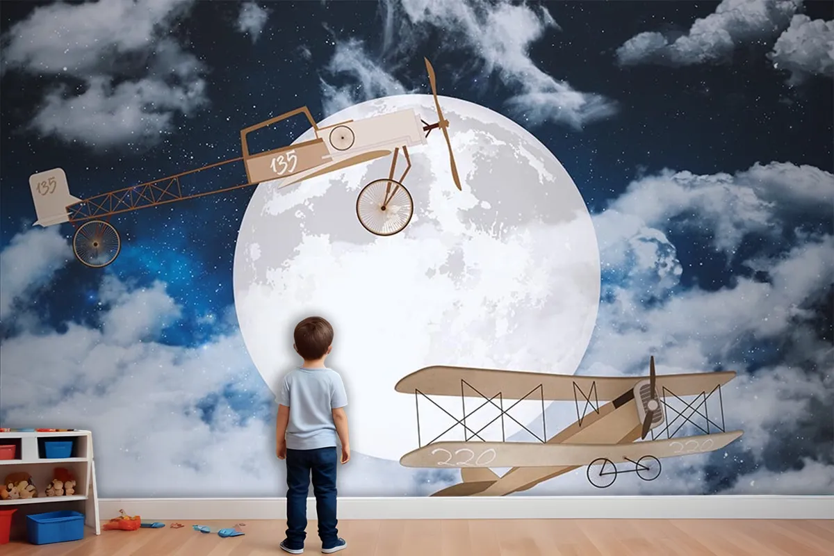 Gökyüzünde Ay Ve Uçaklar Çocuk Odası Duvar Kağıdı