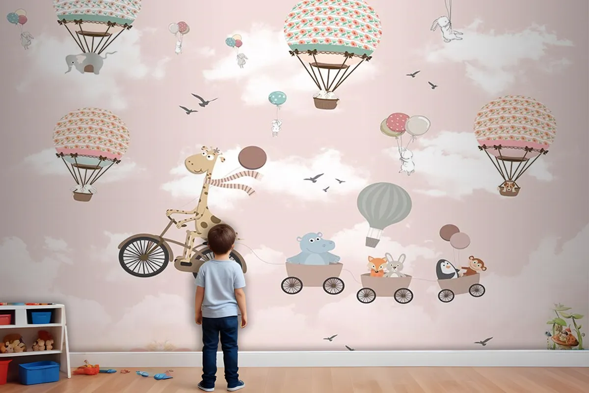 Gökyüzünde Bisiklet Süren Zürafa Ve Arkadaşları Çocuk Odası Duvar Kağıdı