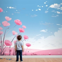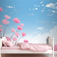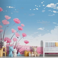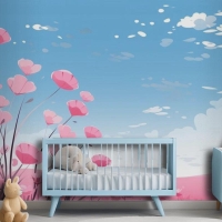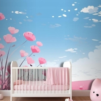 Gökyüzünde Çiçekler Ve Bulutlarla Pembe Kalpler Çocuk Odası Duvar Kağıdı