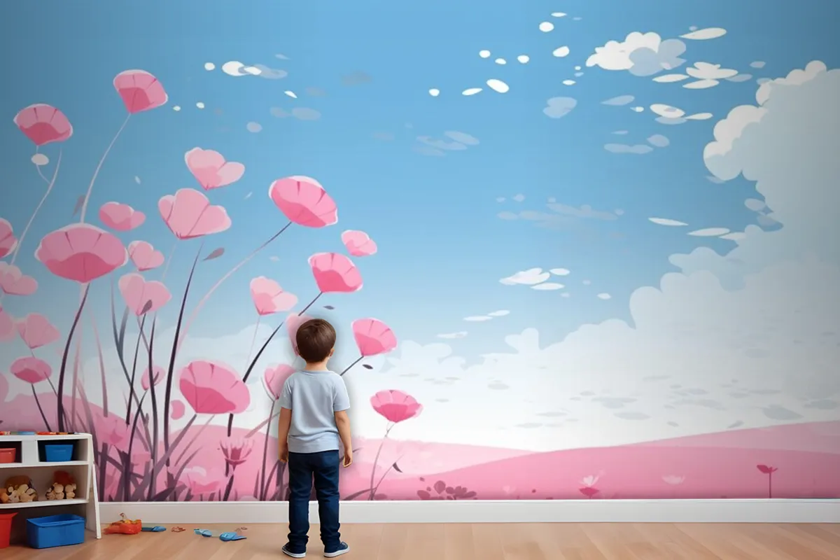 Gökyüzünde Çiçekler Ve Bulutlarla Pembe Kalpler Çocuk Odası Duvar Kağıdı