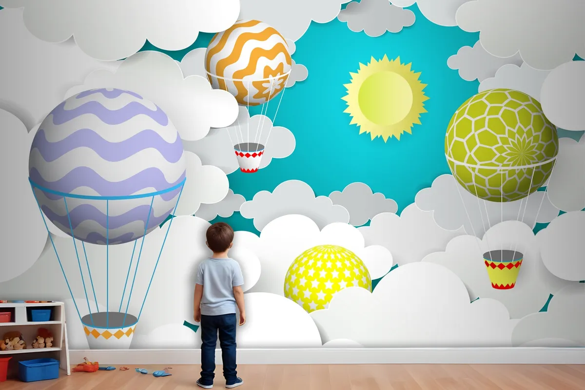Gökyüzünde Sıcak Hava Balonları Kağıt Sanat Tarzı Çocuk Odası Duvar Kağıdı