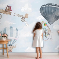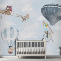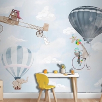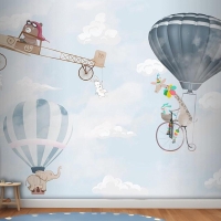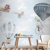 Gökyüzünde Uçak Balonlar Ve Sevimli Hayvanlar Çocuk Odası Duvar Kağıdı
