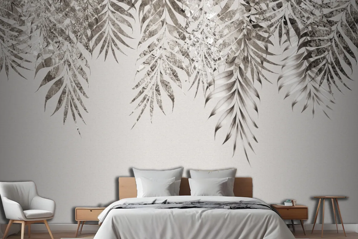 Gri Dallar Ağaç Yaprakları Çizim Yatak Odası Duvar Kağıdı