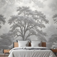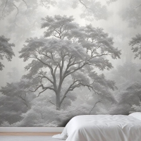 Gri Orman İllüstrasyon Gravür Yatak Odası Duvar Kağıdı