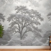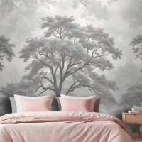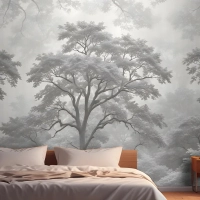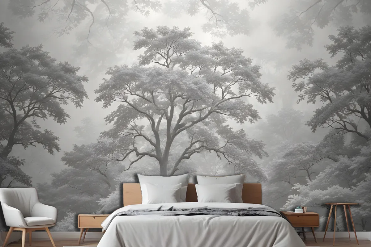 Gri Orman İllüstrasyon Gravür Yatak Odası Duvar Kağıdı