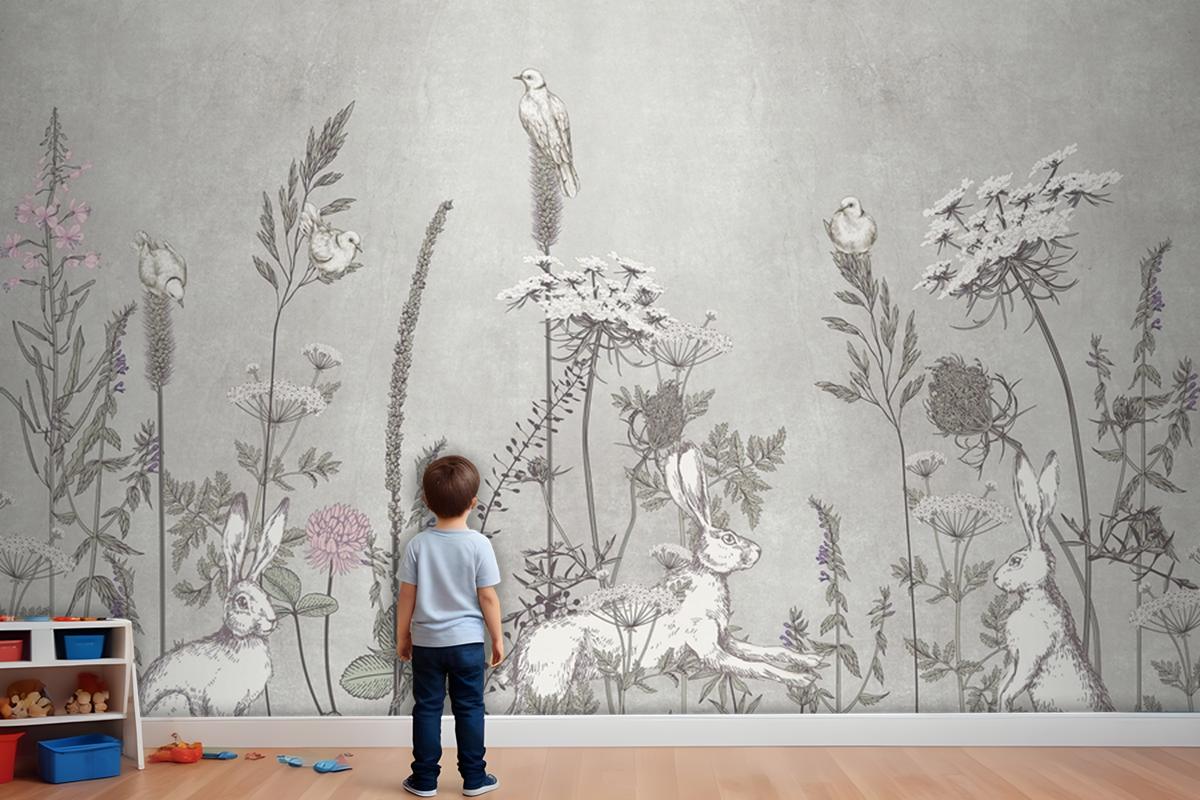 Gri Tavşanlar Ve Çiçekler Çocuk Odası Duvar Kağıdı