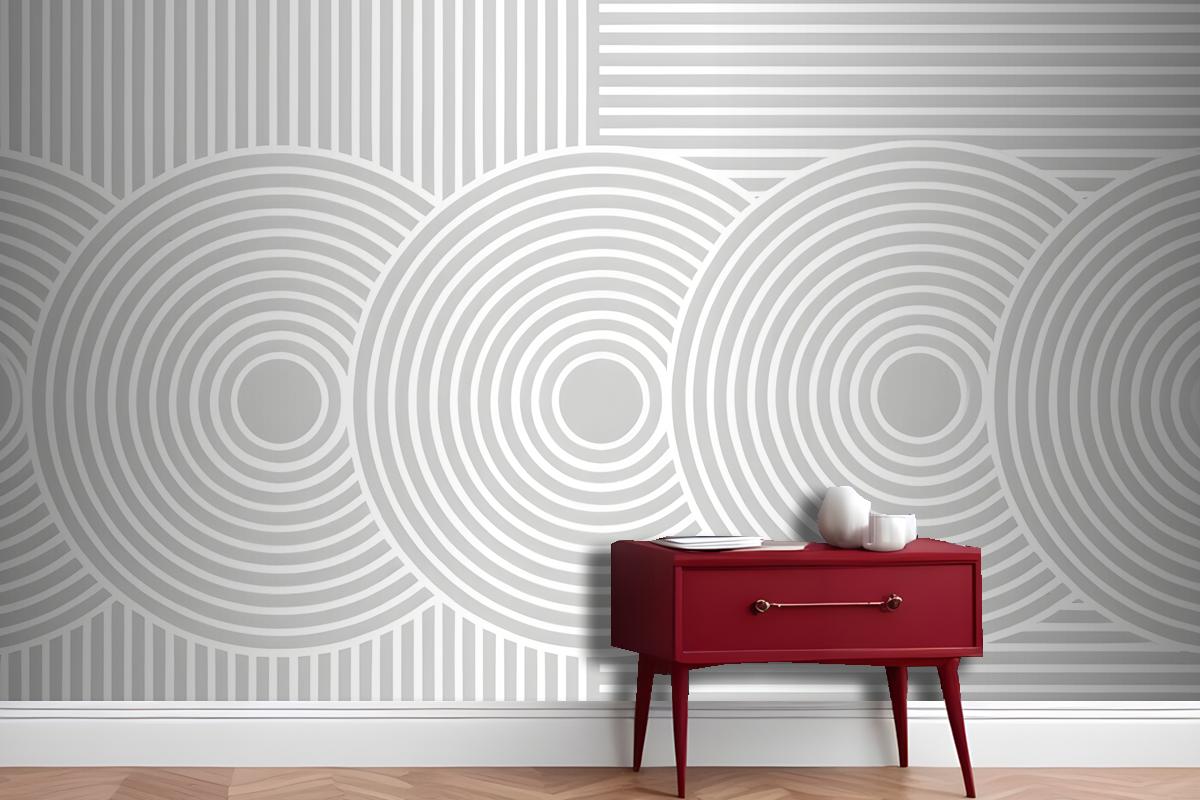 Gri Tonlarında Eşmerkezli Dairelerin Ve Dikey Çizgilerin Minimalist Soyut Geometrik Desenleri Antre Hol Koridor Duvar Kağıdı
