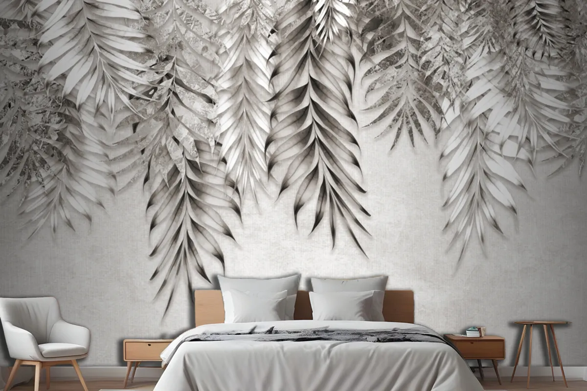 Gri Ve Beyaz Dallar Ağaçların Yaprakları Çizim Yatak Odası Duvar Kağıdı