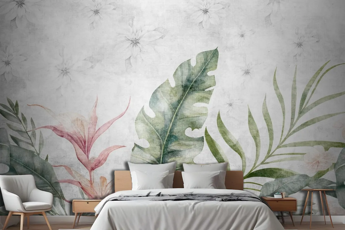 Gri Yatak Odası Duvar Kağıdı Duvar Çiziminde Yeşil Dallar Ağaç Yaprakları