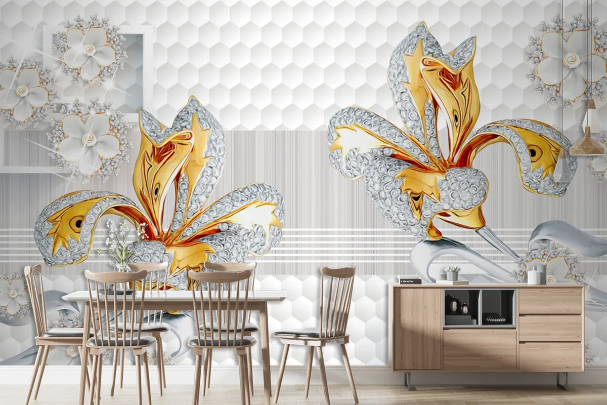 Gümüş Ve Altın Detaylı Çiçekli Arka Planlı 3D Duvar Kağıdı