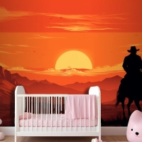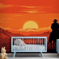 Gün Batımı Önünde Ata Binen Bir Kovboy Tablosu Çocuk Odası Duvar Kağıdı