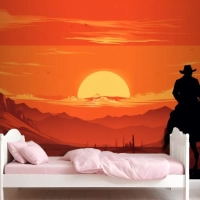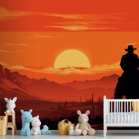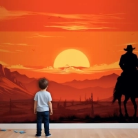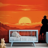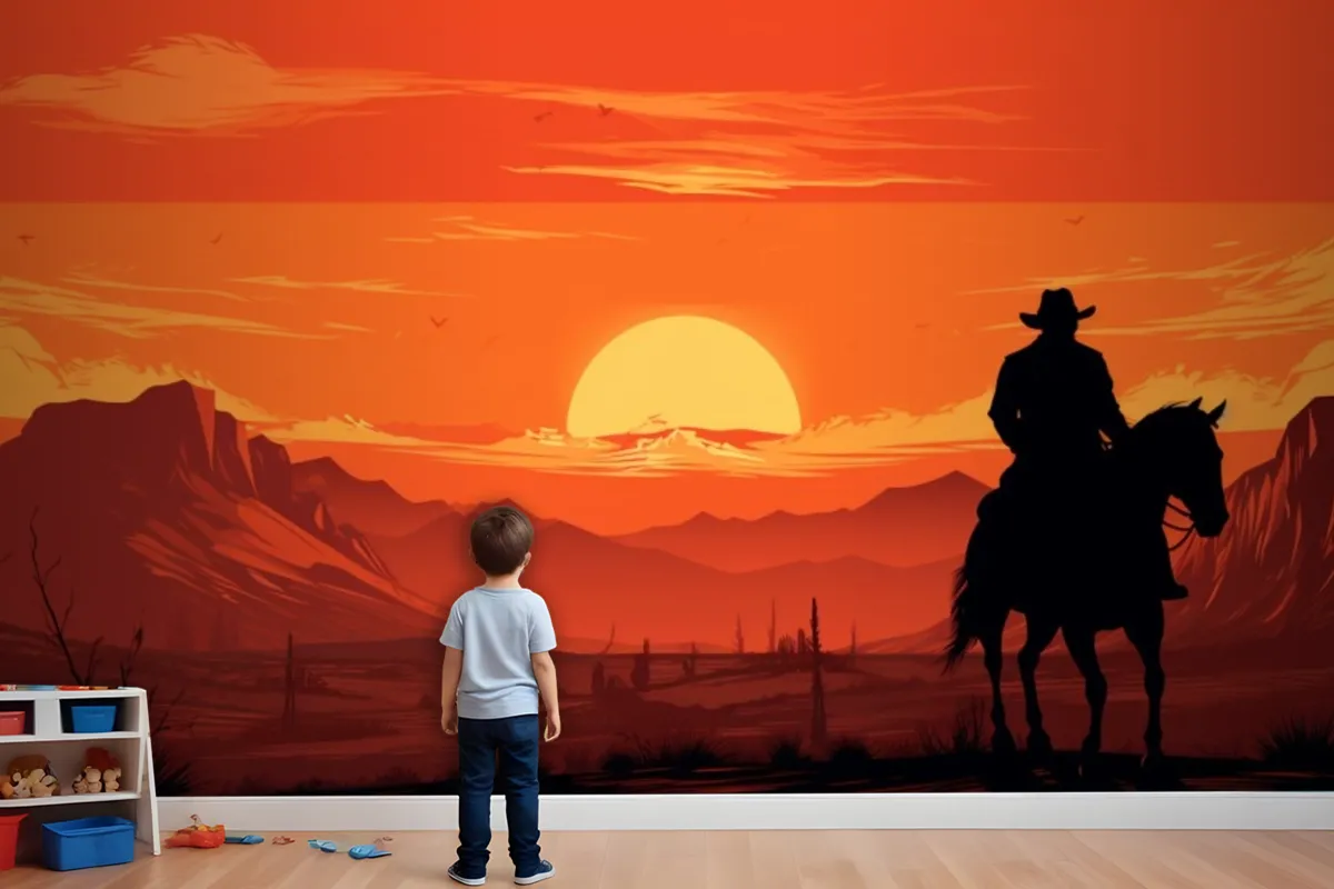 Gün Batımı Önünde Ata Binen Bir Kovboy Tablosu Çocuk Odası Duvar Kağıdı