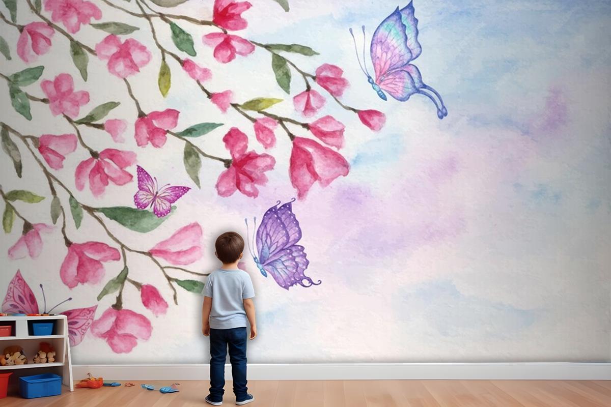 Güzel Kelebekler Çocuk Odası Duvar Kağıdı Ile Suluboya Bahar Manzara Arka Plan