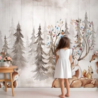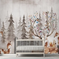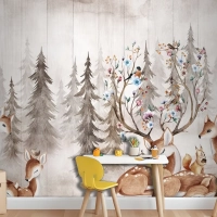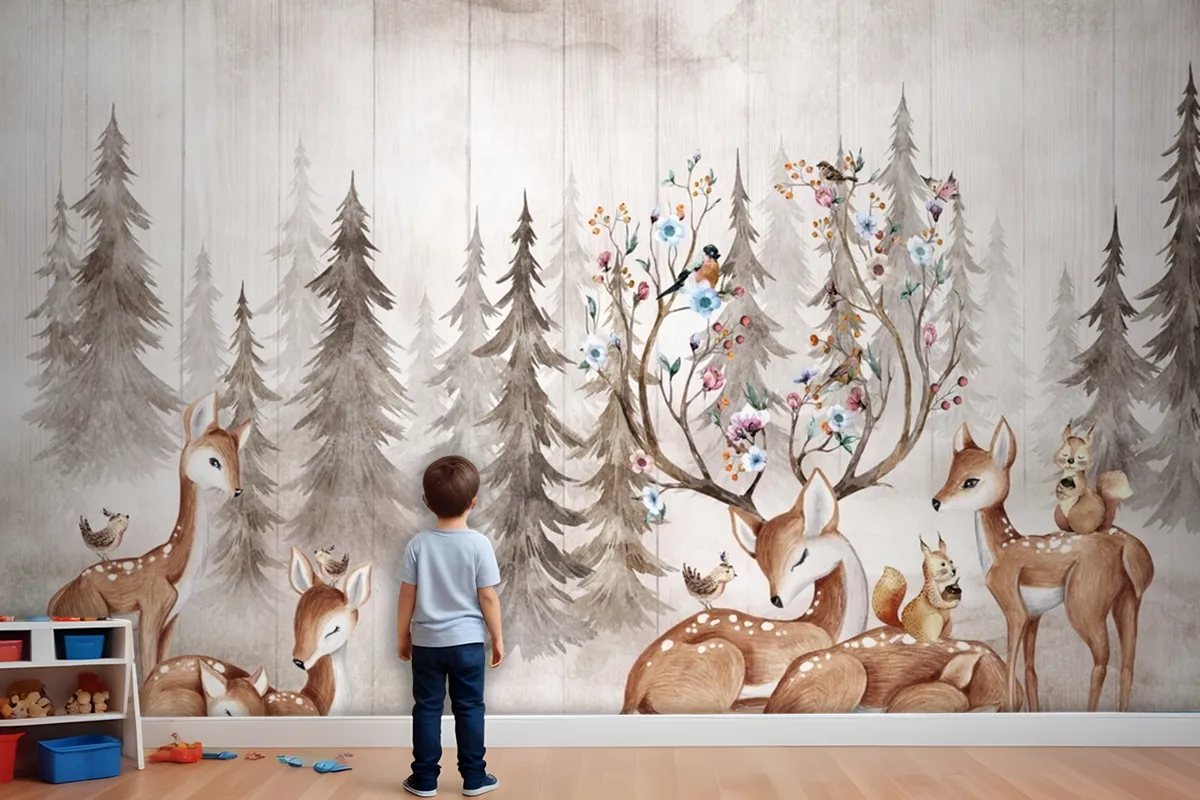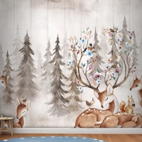 Hayvanlarla Suluboya Orman Geyik Çocuk Odası Duvar Kağıdı