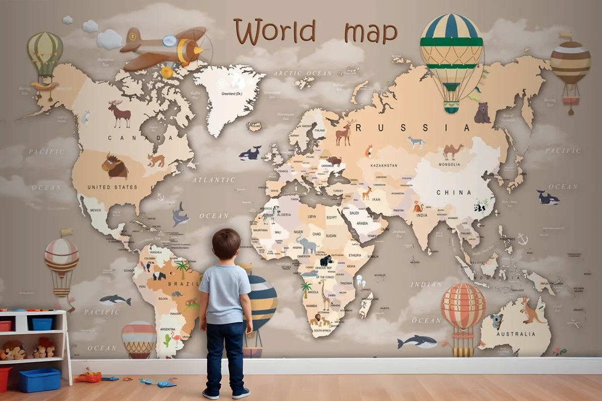 Hayvanlı Ve Sıcak Hava Balonlu Dünya Haritası Çocuk Odası Duvar Kağıdı