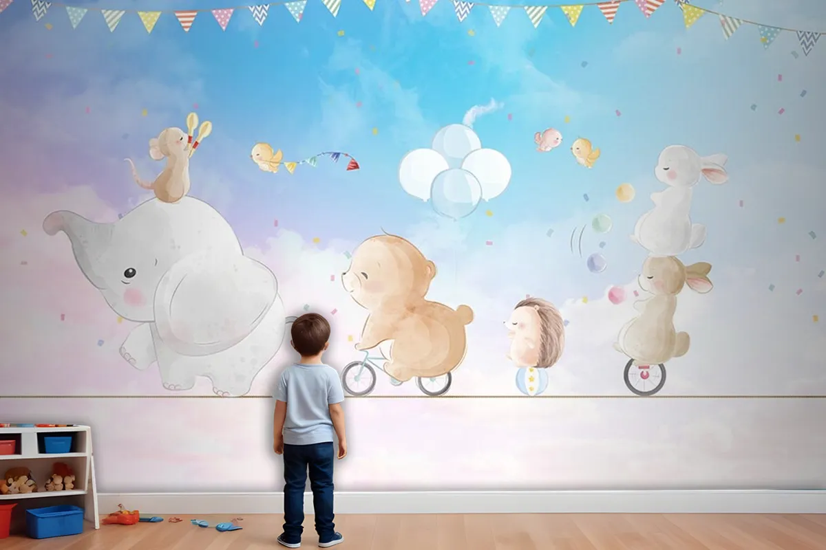 İp Üstünde Mutlu Hayvanlar Çocuk Odası Duvar Kağıdı