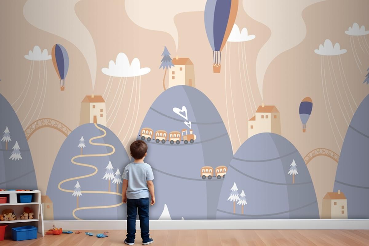 İskandinav Manzara Tepeler Sıcak Hava Balonları Tren Çocuk Bebek Odası Duvar Kağıdı