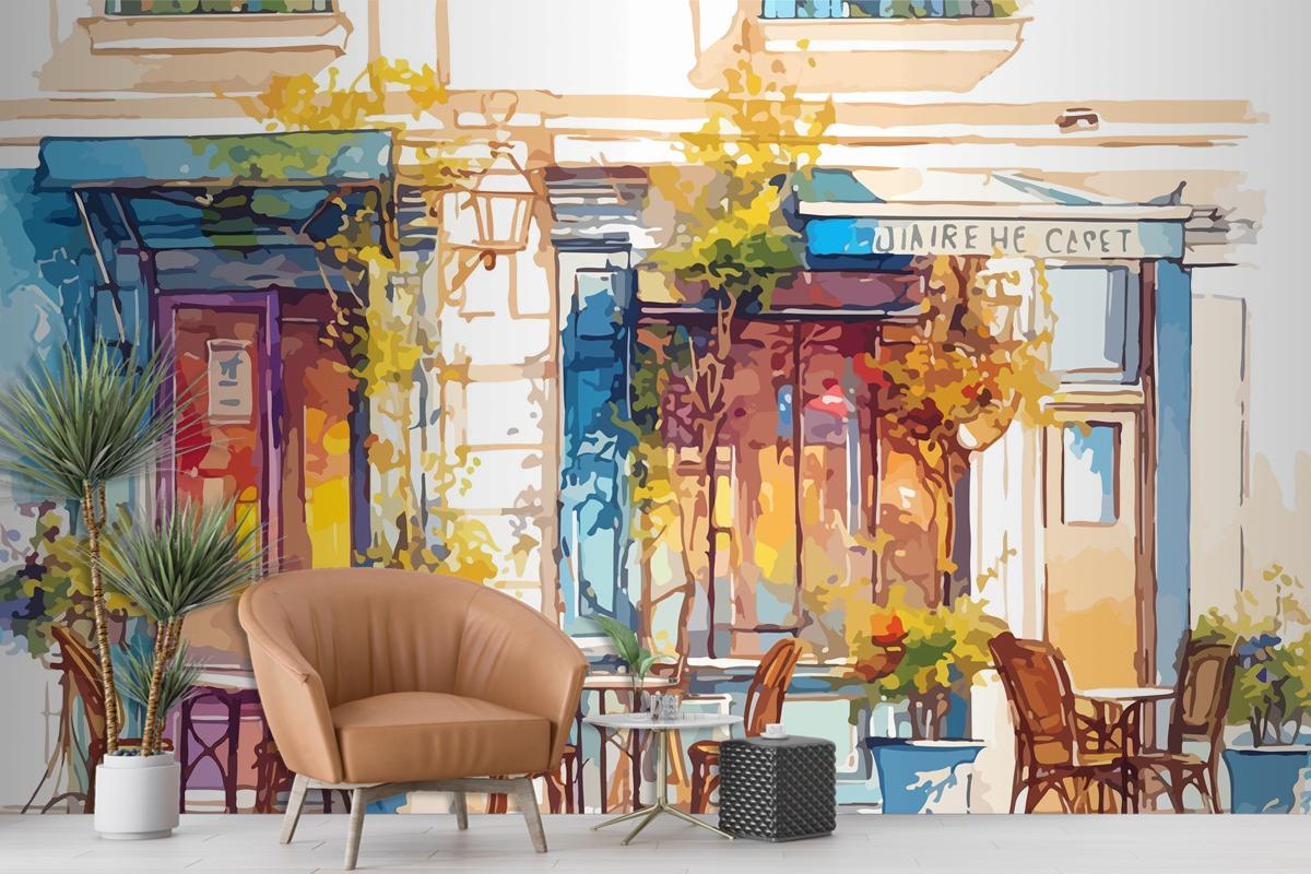 Kaldırım Kafe Veya Restoran Sulu Boya Duvar Kağıdı