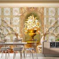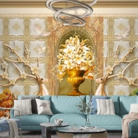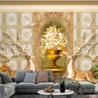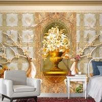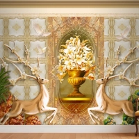 Kalıplı Klasik Iç Duvar Ortada Saksı Ve Geyikler 3D Duvar Kağıdı
