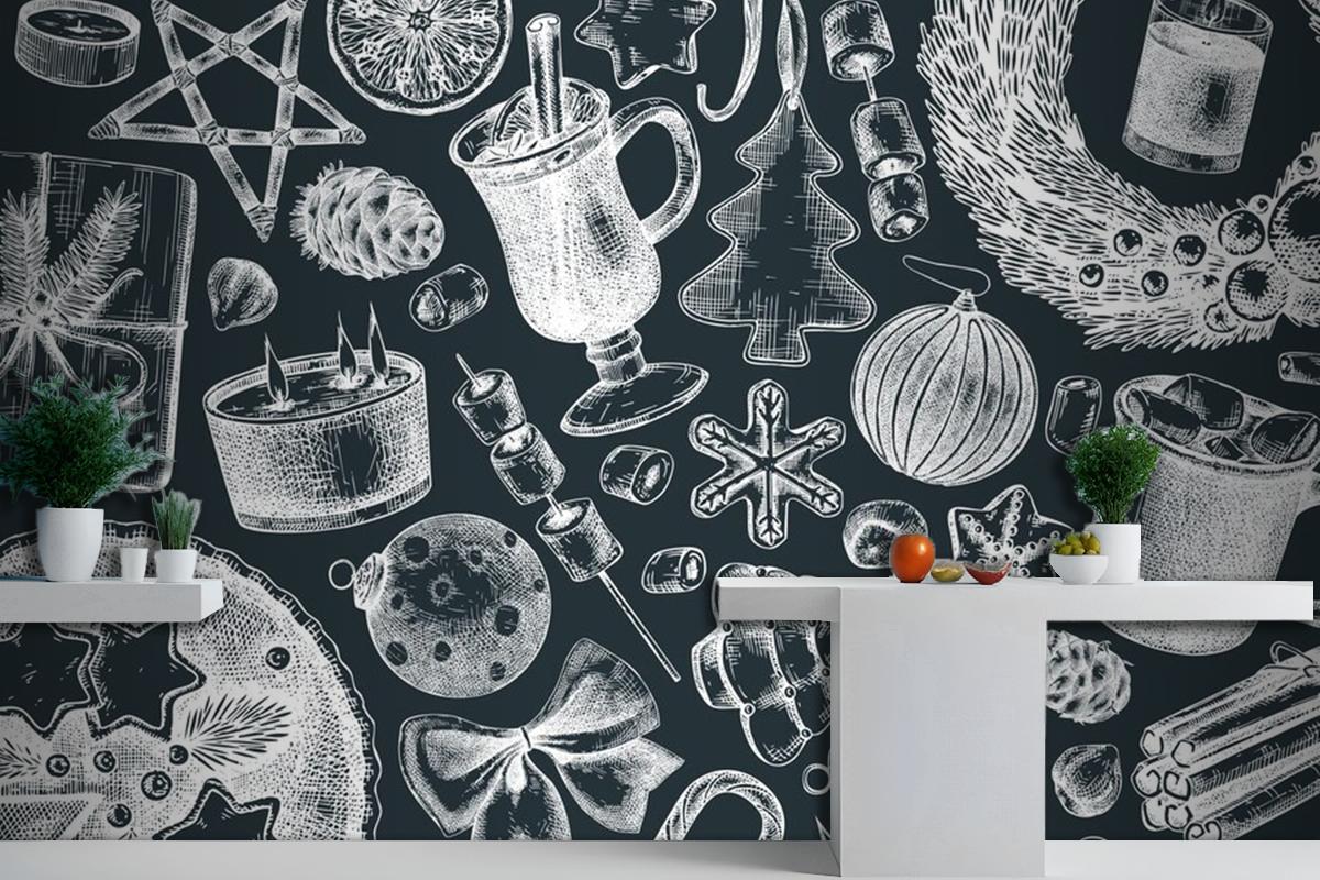 Kara Tahta Üzerinde Vintage Noel Afiş Tasarımı Elle Çizilmiş Tatil Mutfak Duvar Kağıdı