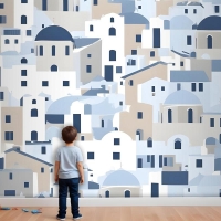 Karikatür Eski Mavi Yunan Evi Çocuk Odası Duvar Kağıdı