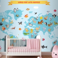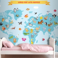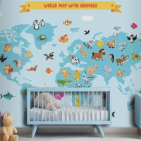 Karikatür Hayvanlı Dünya Haritası Çocuk Odası Duvar Kağıdı