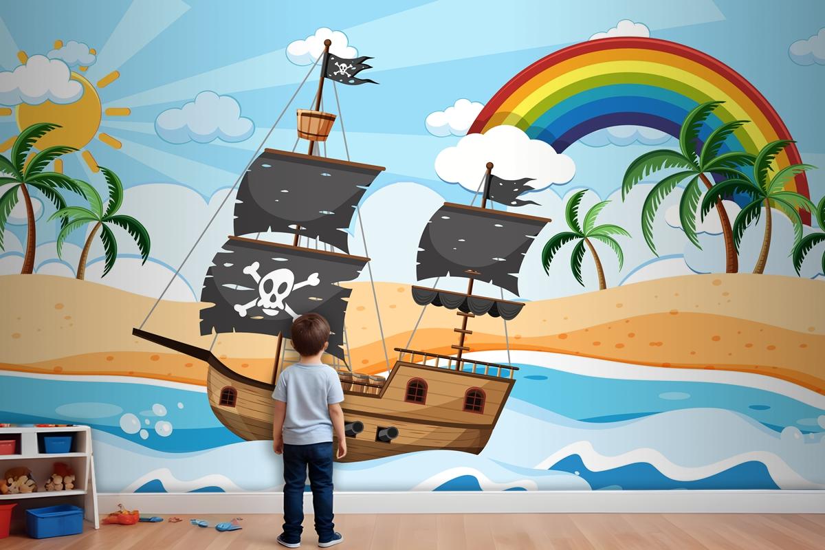 Karikatür Tarzı Çocuk Odası Duvar Kağıdı Duvarında Gündüz Sahnesinde Korsan Gemisi Ile Okyanus