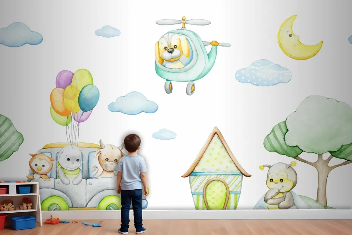 Karikatür Tarzı Tropikal Hayvanlar Araba Helikopter Ay Çocuk Odası Duvar Kağıdı Nde Suluboya Dikişsiz Desen