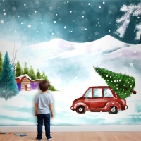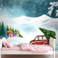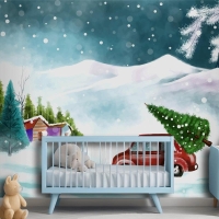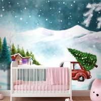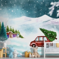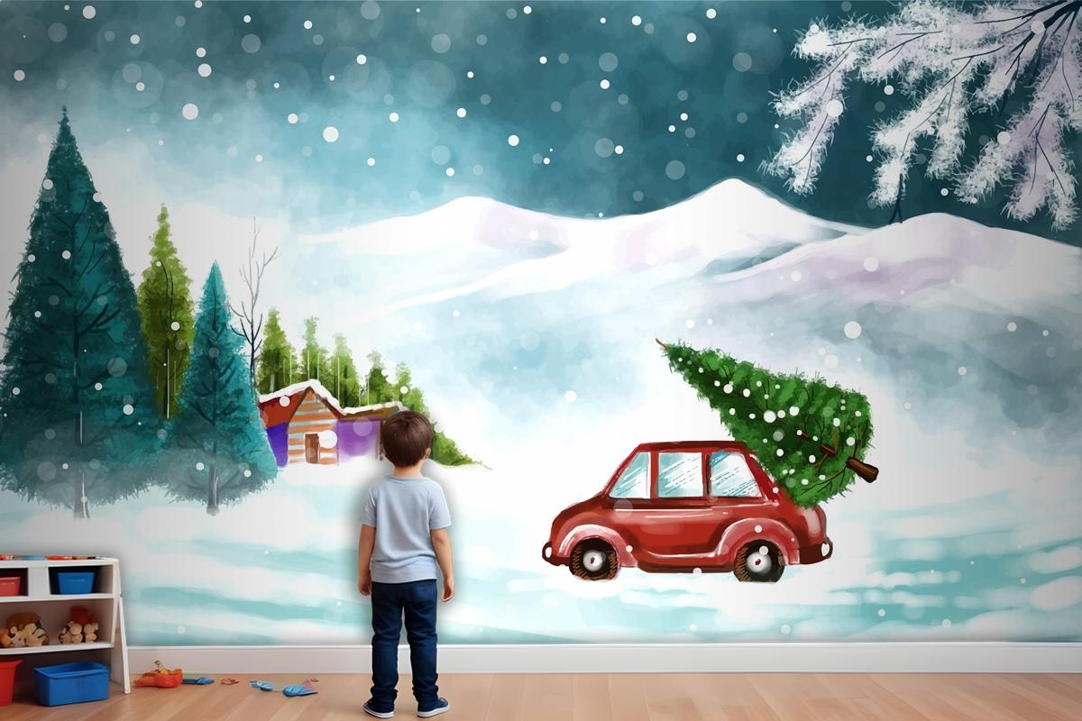 Karlı Noel Ağacında Arabayla Güzel Kış Manzarası Çocuk Odası Duvar Kağıdı
