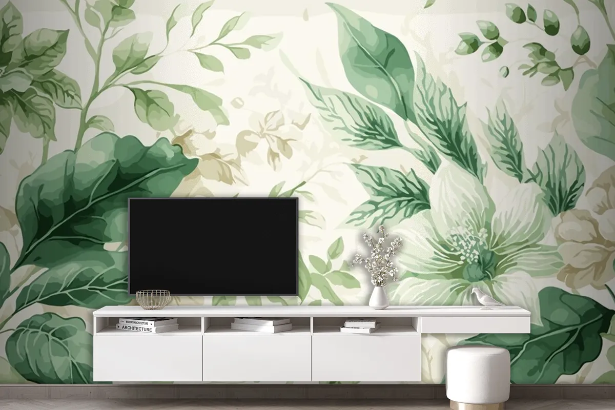 Kesintisiz Suluboya Yeşil Ve Bej Çiçek Desenli Oturma Odası Duvar Kağıdı