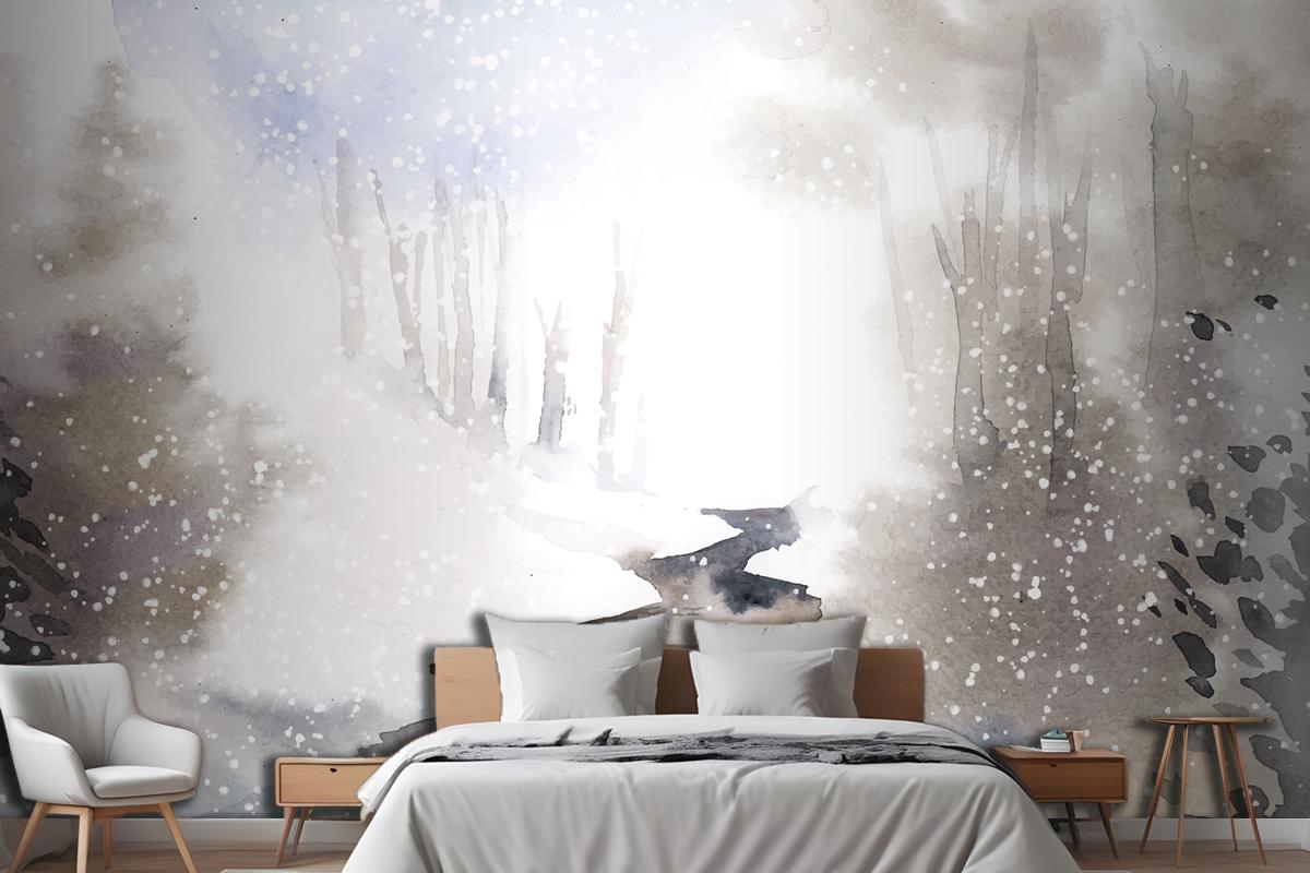 Kış Harikalar Diyarı Manzarası Suluboya Yatak Odası Duvar Kağıdı Ile Boyalı