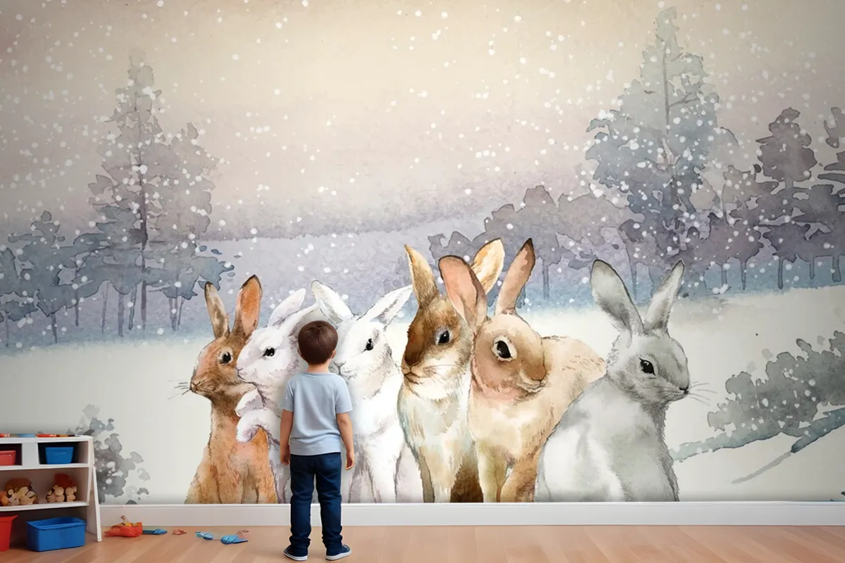 Kışın Karda Vahşi Tavşanlar Suluboya Çocuk Odası Duvar Kağıdı Ile Boyanmış