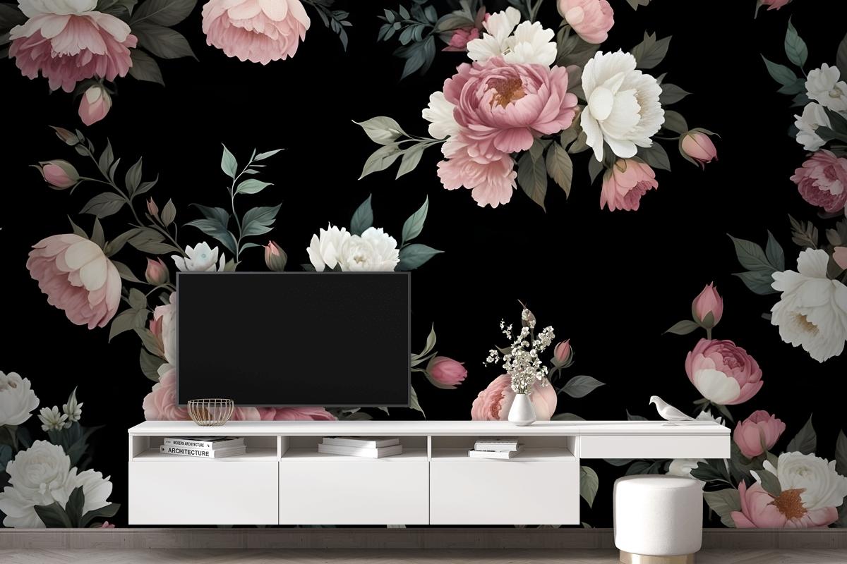 Koyu Arka Plan Büyük Pembe Beyaz Güller Şakayık Diğer Çiçekler Oturma Odası Salon Duvar Kağıdı