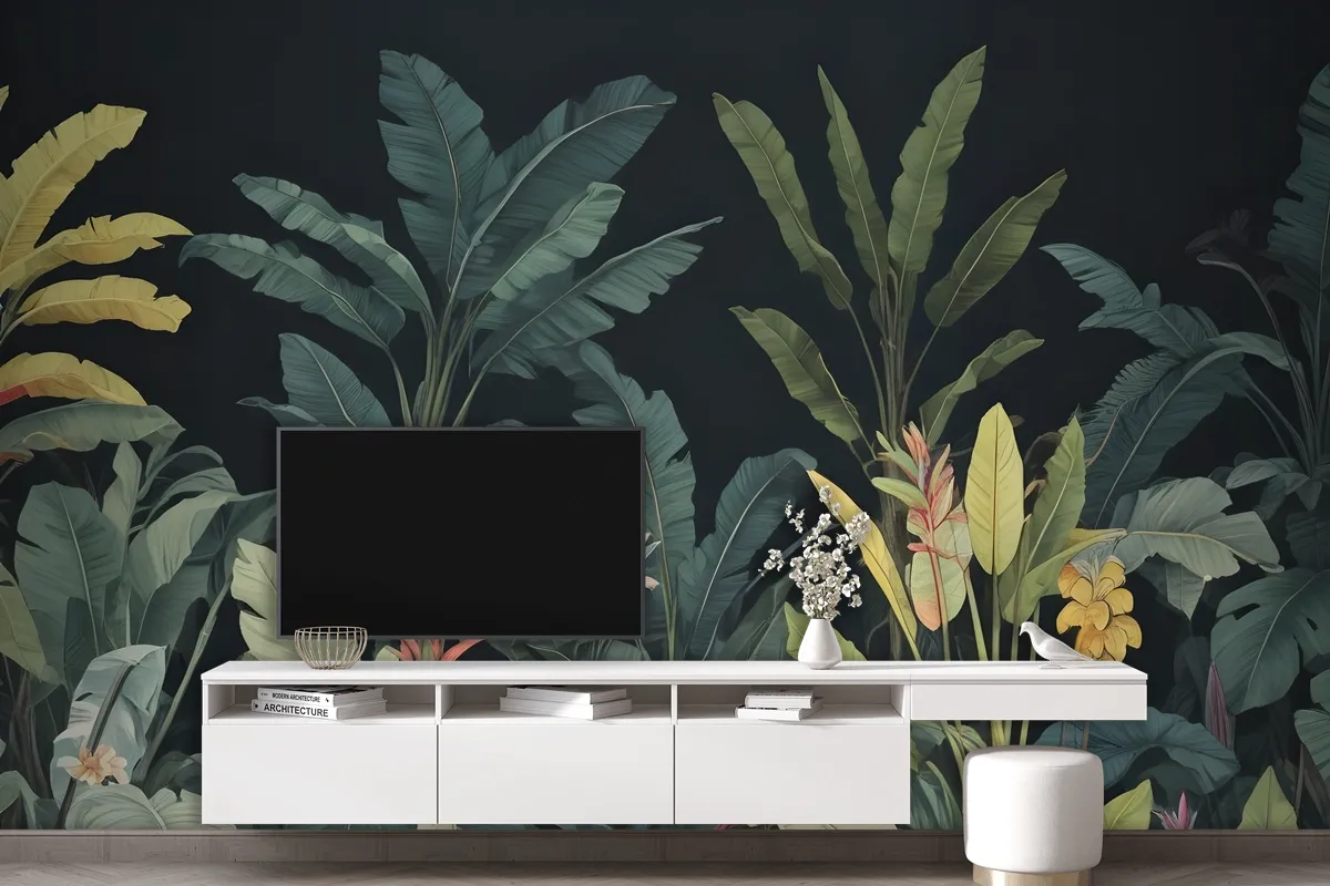 Koyu Arka Plan Büyük Yeşil Yapraklar Muz Bitkiler Renkli Çiçekler Oturma Odası Salon Duvar Kağıdı