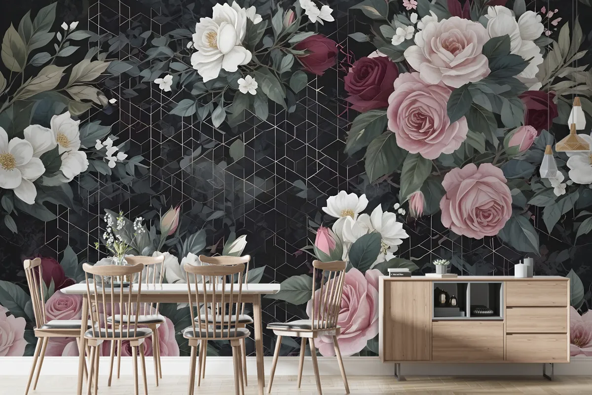 Koyu Geometrik Desenli Renkli Çiçek Duvar Kağıdı