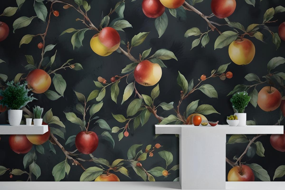 Koyu Yeşil Ve Lacivert Vintage Botanik Meyve Tekrar Desen Mutfak Duvar Kağıdı