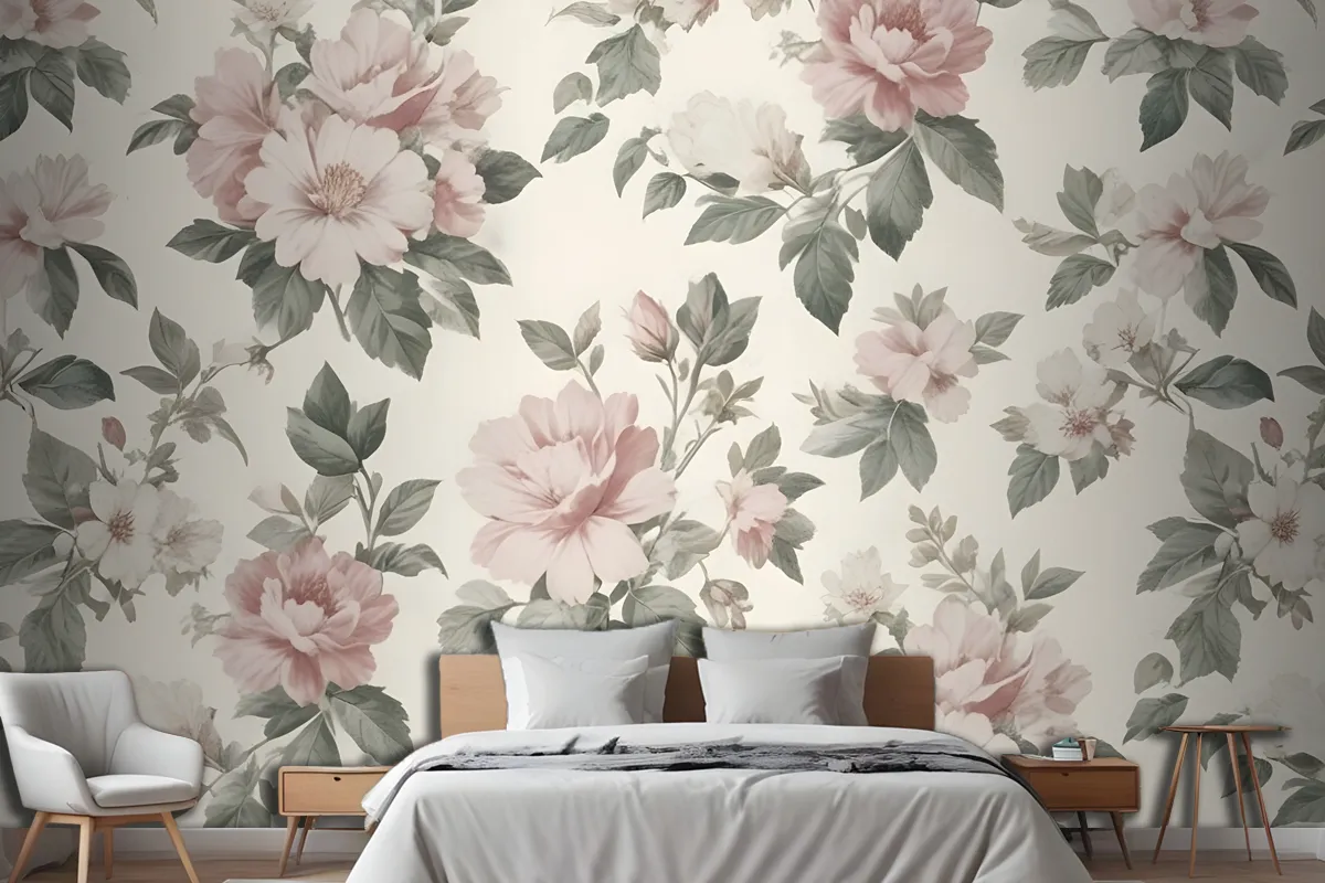 Krem & Pembe Gül Vintage Çiçek Yatak Odası Duvar Kağıdı