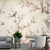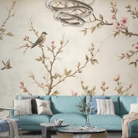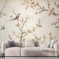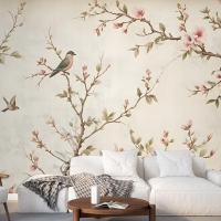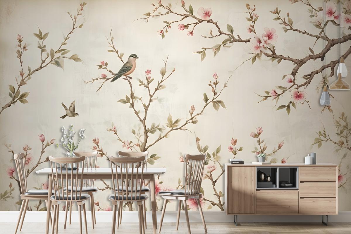 Küçük Kuşlar Ile Yumuşak Çin Çiçekleri Duvar Kağıdı
