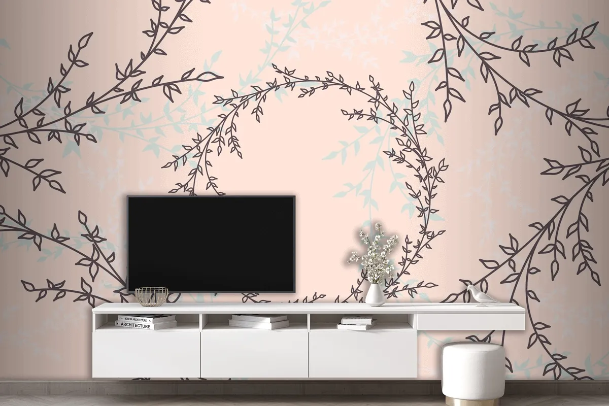 Küçük Yapraklar Ve Dallarla Lüks Çiçekli Şeftali Soyut Tv Arkası Duvar Kağıdı