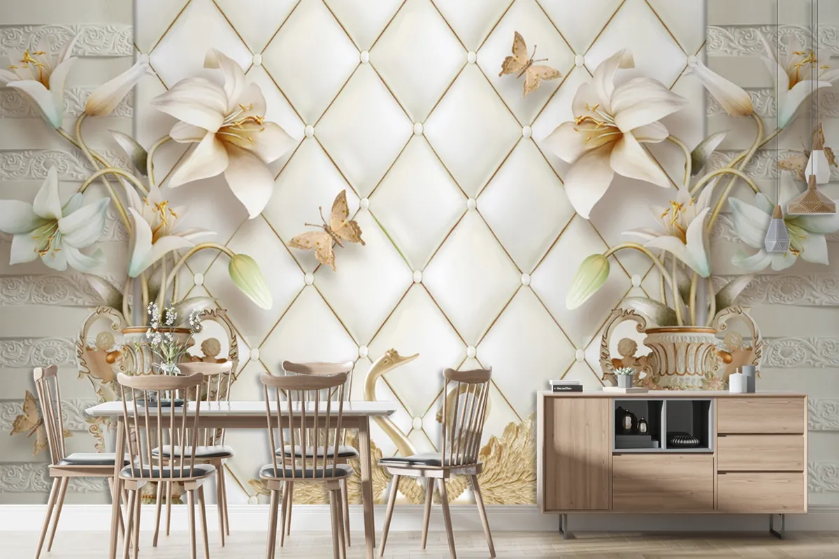 Kuğu Ve Çiçek Arka Planlı 3D Duvar Kağıdı