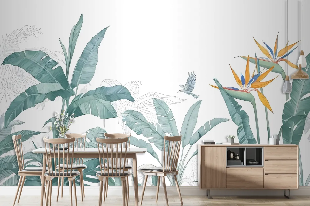 Kuşlu Tropikal Muz Yaprağı Duvar Kağıdı