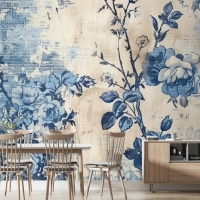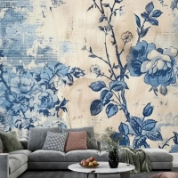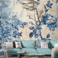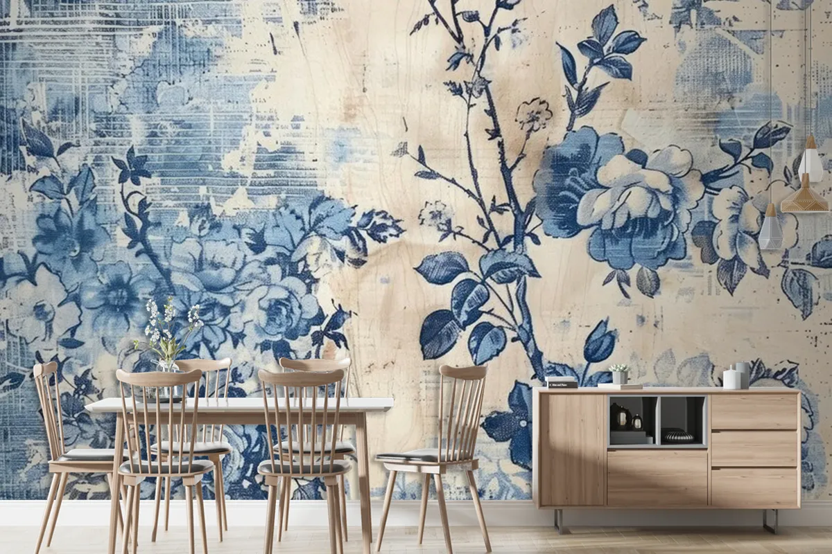 Mavi Beyaz Duvar Kağıdı Duvarında Mavi Beyaz Çiçek Baskısı Var