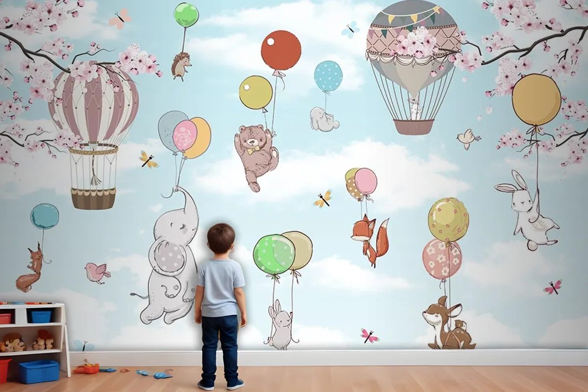 Mavi Gökyüzünde Balonlara Asılan Sevimli Hayvanlar Çocuk Odası Duvar Kağıdı