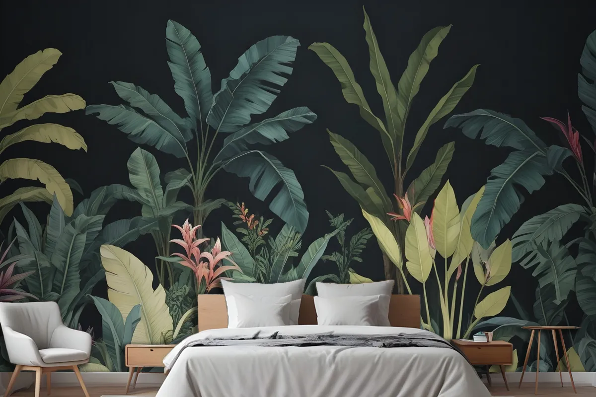 Mavi Ve Yeşil Koyu Tropikal Yatak Odası Duvar Kağıdı