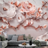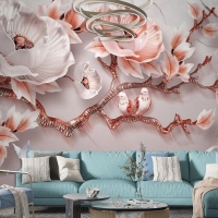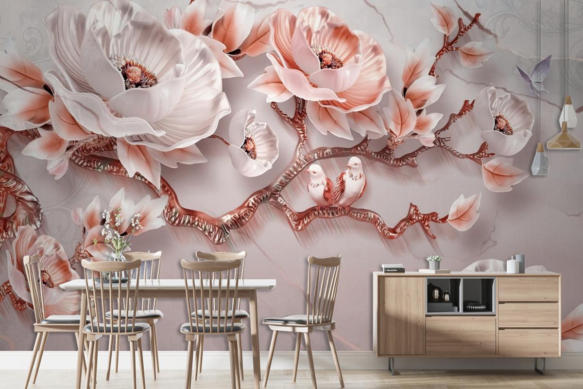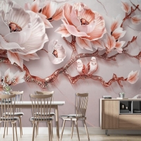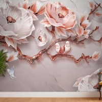 Mermer Arka Planlı Çiçek Ve Kuşlar 3D Duvar Kağıdı